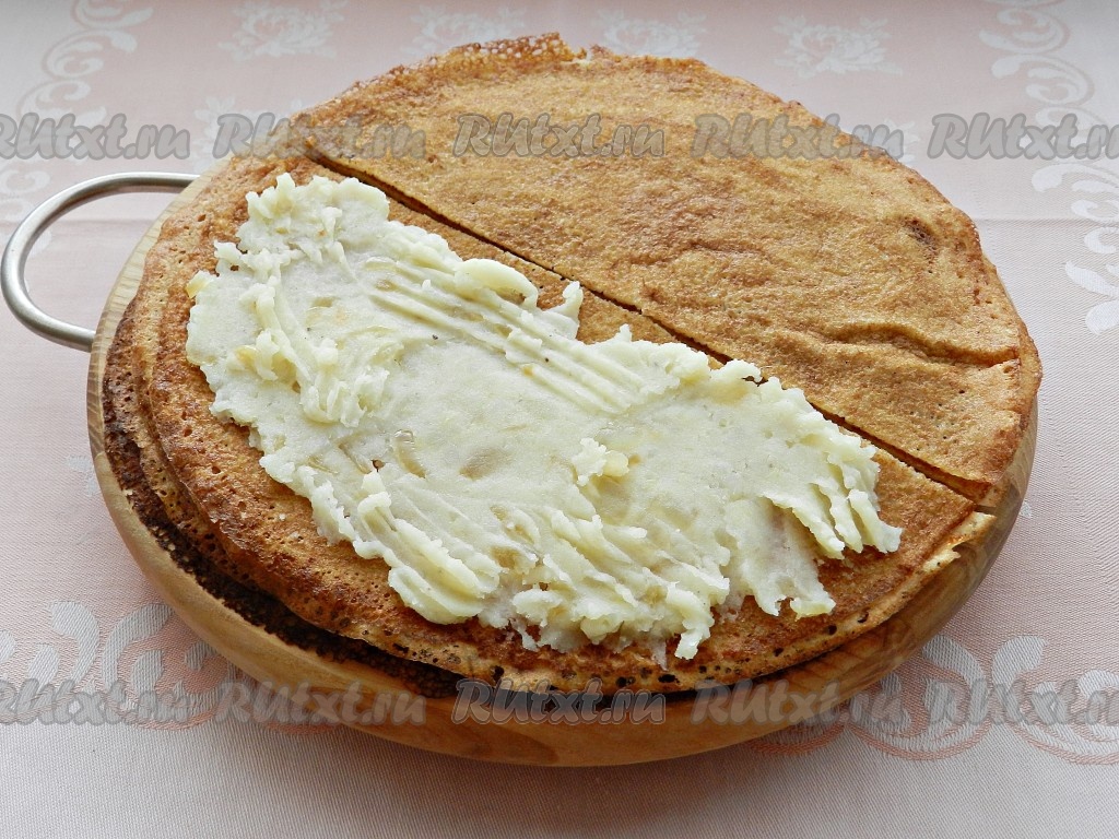 На половинку блина выложить тонким слоем картофельное пюре.