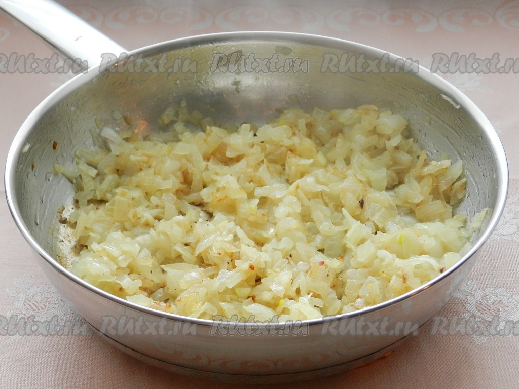 Лук очистить, мелко нарезать и обжарить на растительном масле на среднем огне до золотистого цвета, периодически перемешивания (на обжаривание потребуется минут 7-8).