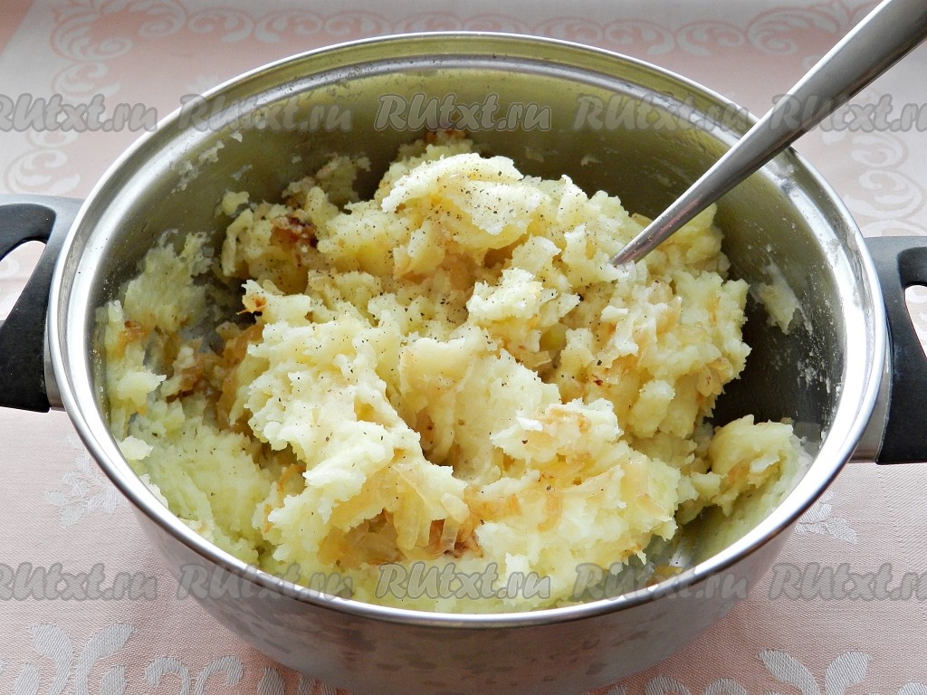Готовый картофель размять в пюре, добавить лук вместе с маслом, на котором он жарился, перемешать. Посолить, если надо, поперчить. Можно добавить мелко нарезанную зелень.