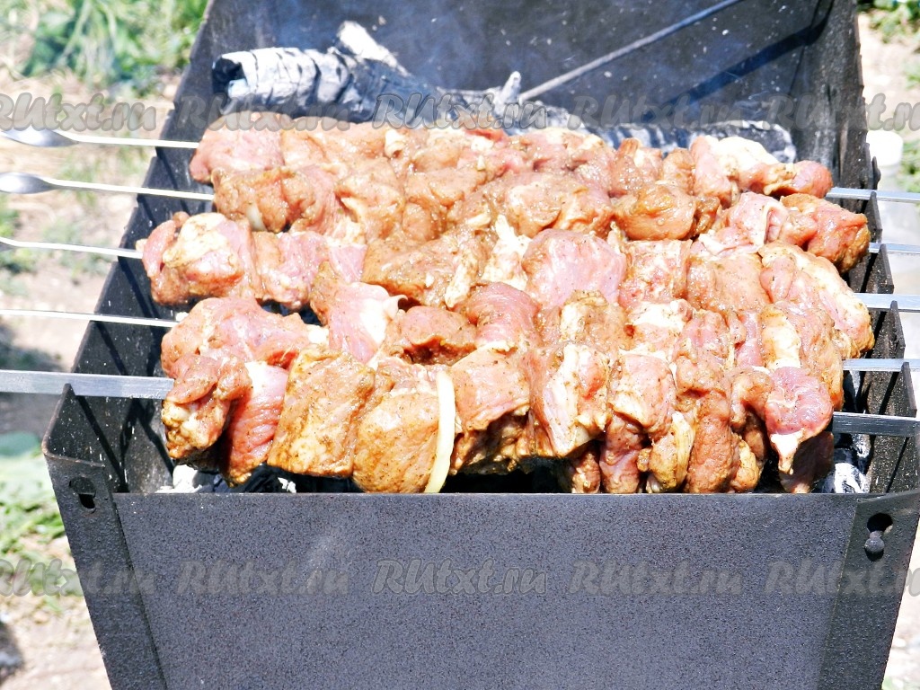 Перед нанизыванием на шампуры мясо посолить или сделать это уже непосредственно на мангале. Жарить шашлык над раскаленными углями, не допуская горения, до готовности.