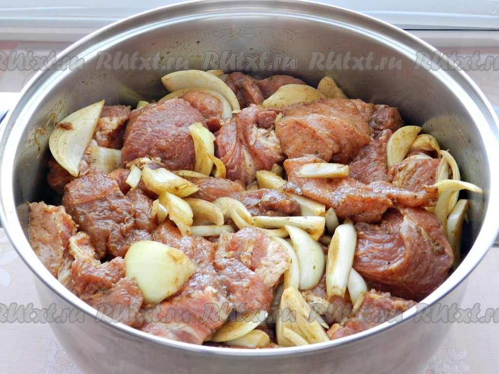 Мясо нарезать (мы обычно режем крупно), лук нарезать произвольно.