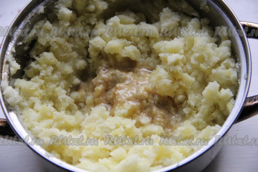 Слить с готового картофеля воду в отдельную чашку. Размять горячую картошку толкушкой в пюре.