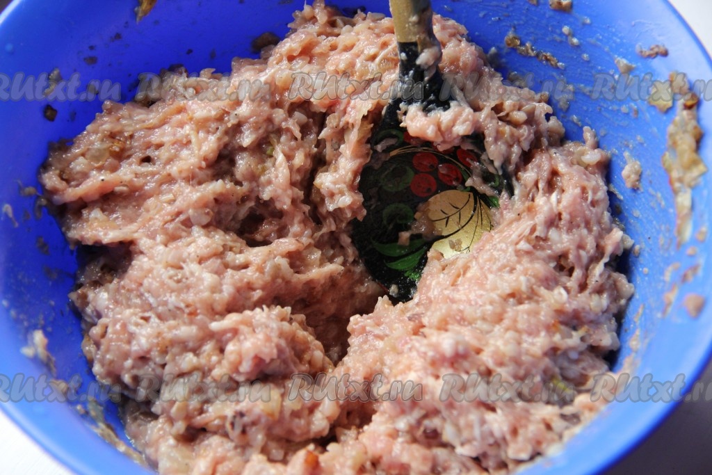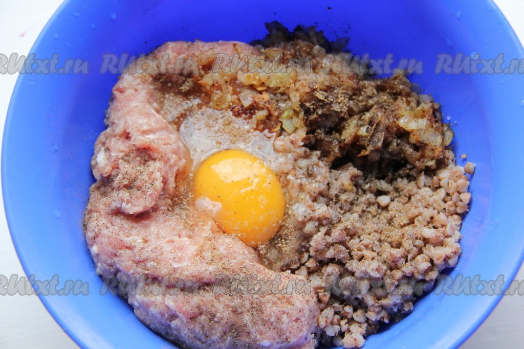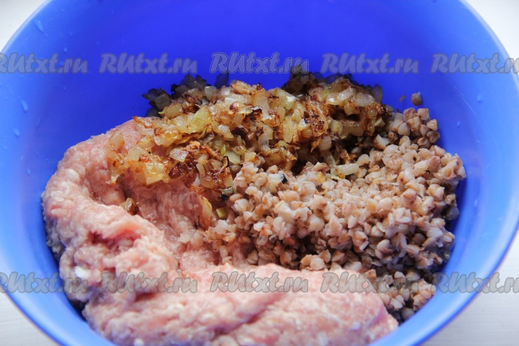Лук мелко порезать и обжарить на растительном масле до золотистого цвета. В отдельной миске смешать мясной фарш, отварную гречку и обжаренный лук.