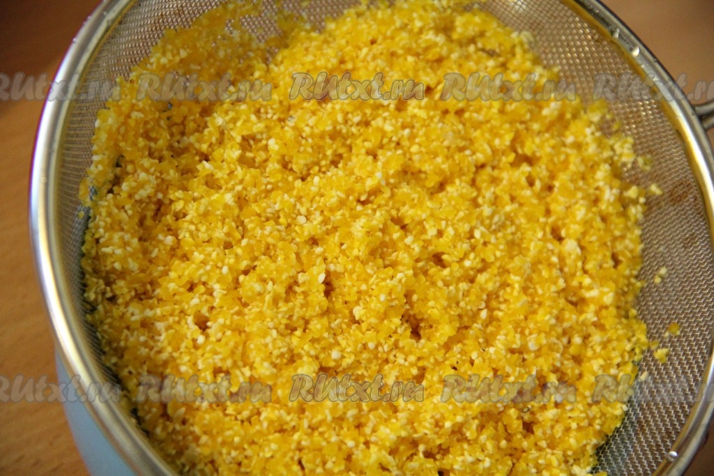 Кукурузную крупу выложить в сито, хорошо промыть под проточной водой, а затем оставить в сите на пару минут, чтобы стекла лишняя вода.