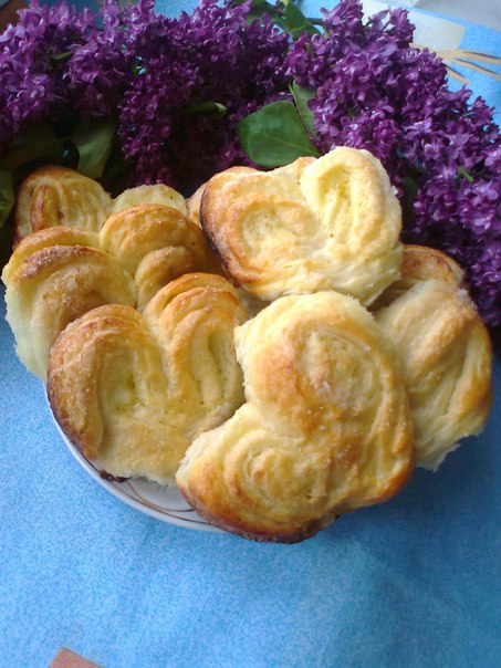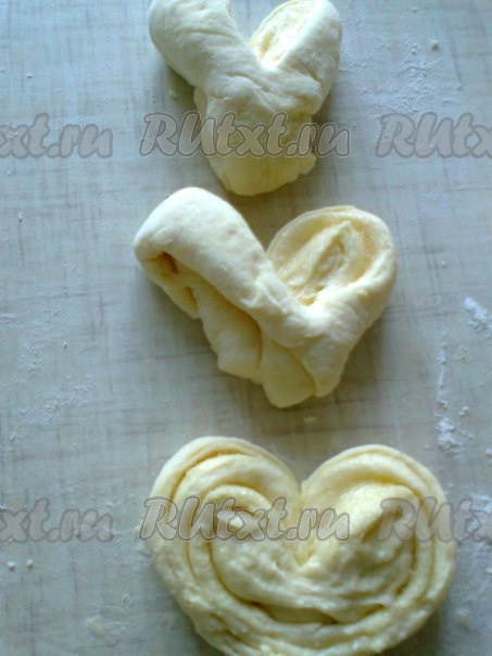 Разворачиваем тесто в стороны, как книжку. Аналогично формируем все булочки в форме сердечек.