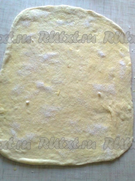 Из другой части теста можно приготовить булочки в виде розочек. Для этого раскатываем тесто в виде прямоугольника, смазываем его растительным маслом, посыпаем сахаром.