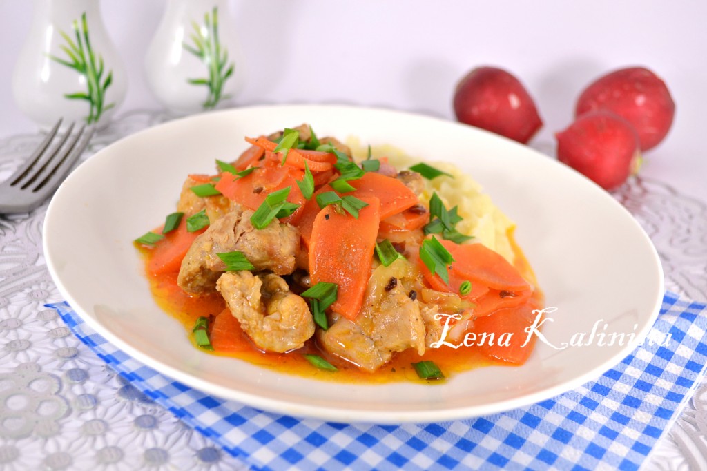 Подать невероятно вкусную, сочную и нежную свинину, тушеную с морковью и луком, с любым гарниром по вашему вкусу.