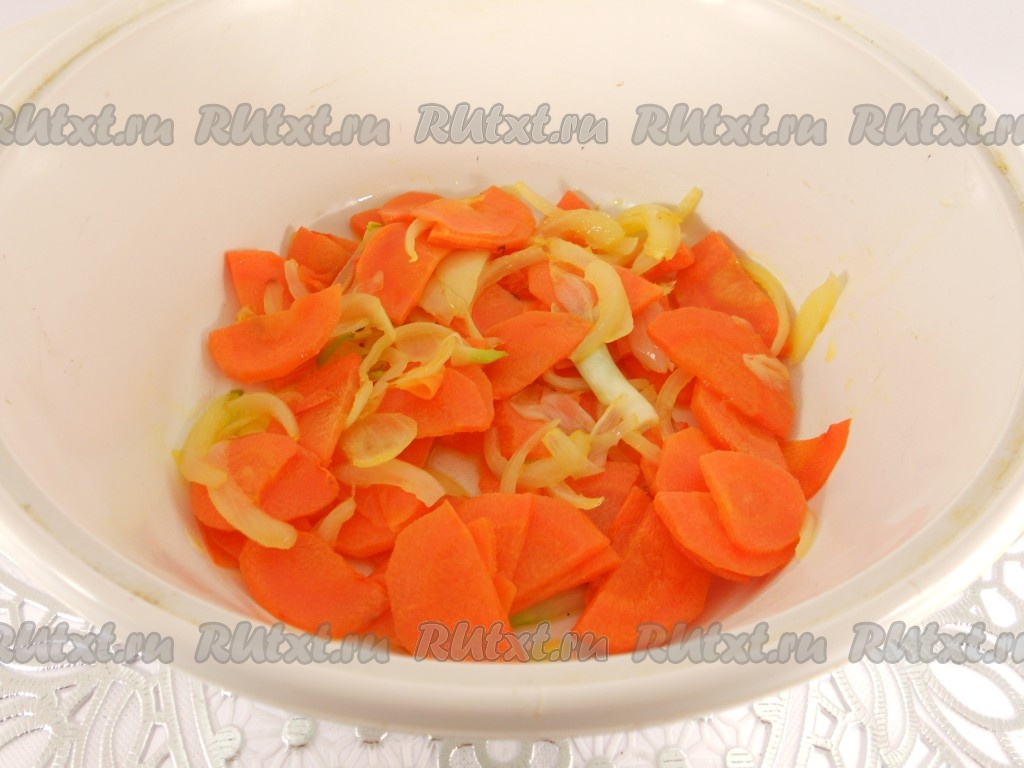 Лук очистить и порезать полукольцами, морковь порезать тонкими полукружочками. Обжарить овощи на сковороде с растительным маслом буквально минуты 3-4, не забывая помешивать, и переложить в кастрюльку.
