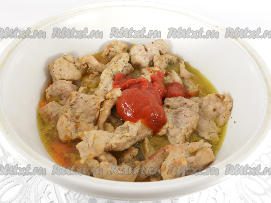 Добавить томатную пасту, слегка перемешать мясо с овощами.