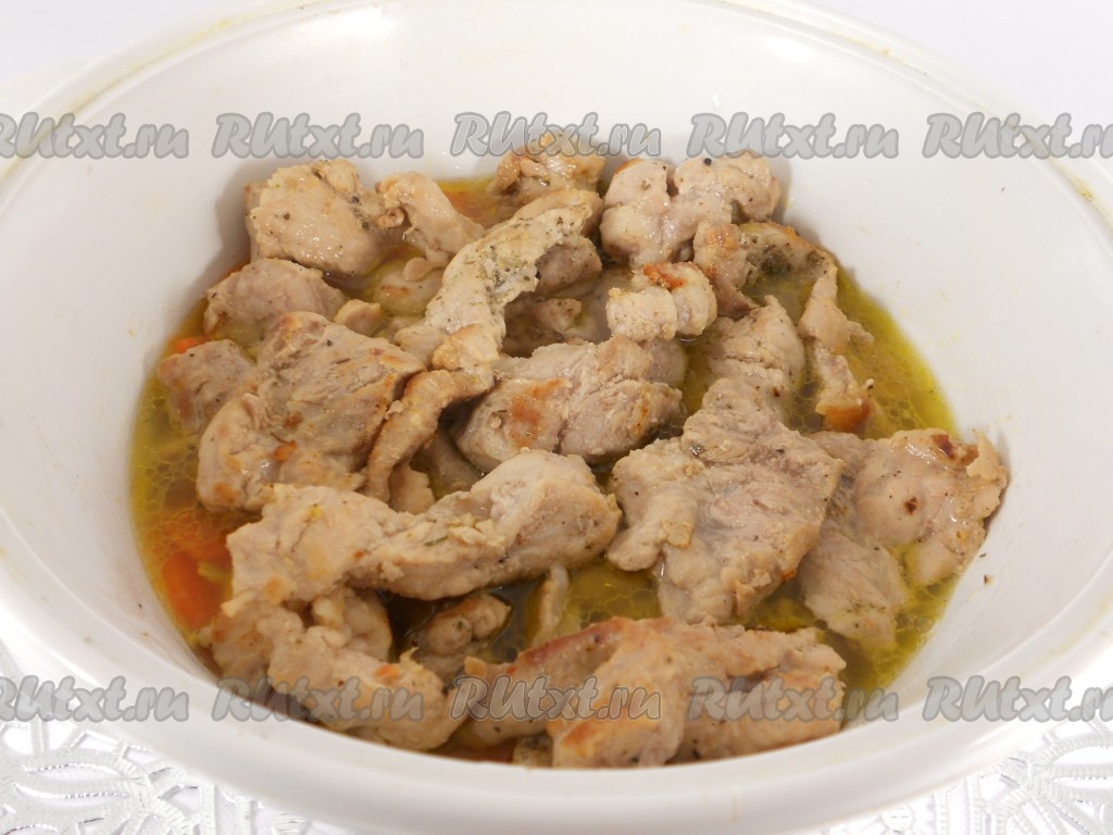 Свинину обжарить на сильном огне на той же сковороде, посыпав специями и черным молотым перцем, до легкой румяной корочки. После этого добавить свинину к моркови и луку. Посолить по вкусу, влить бульон.