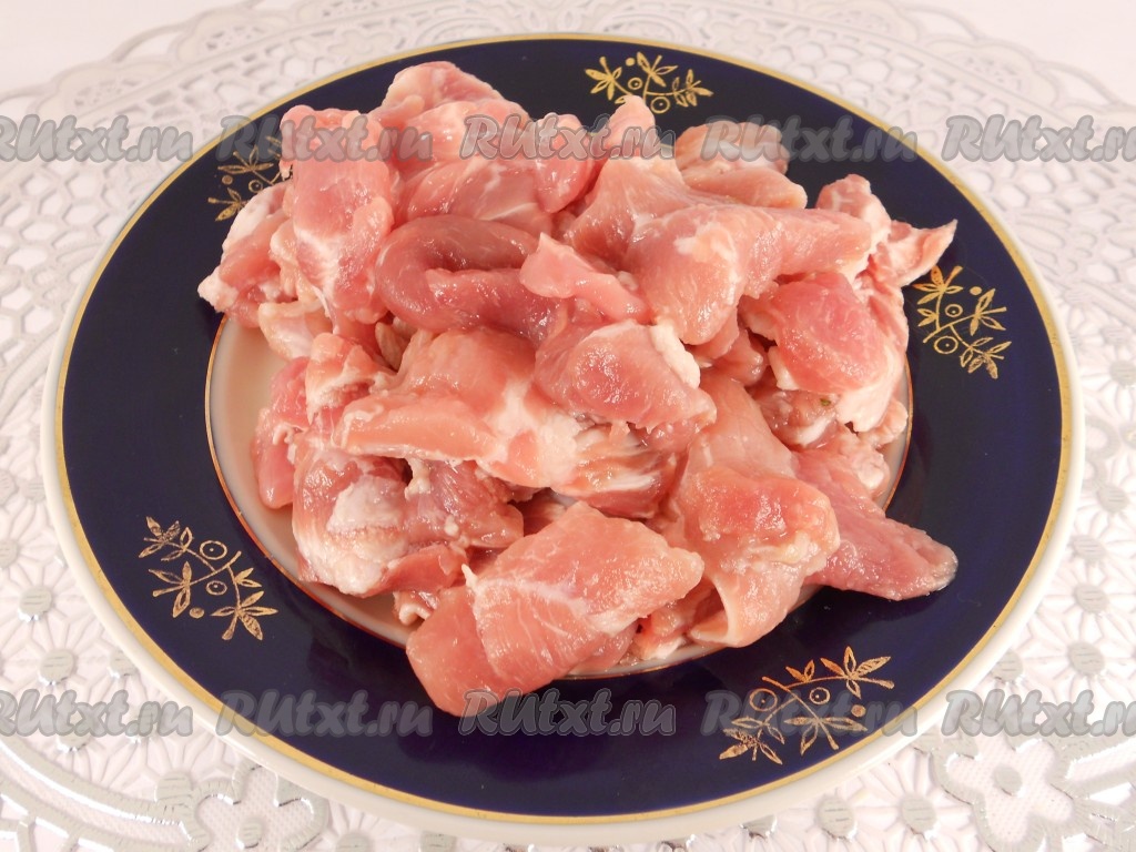 Свинину вымыть, обсушить и порезать небольшими кусочками.