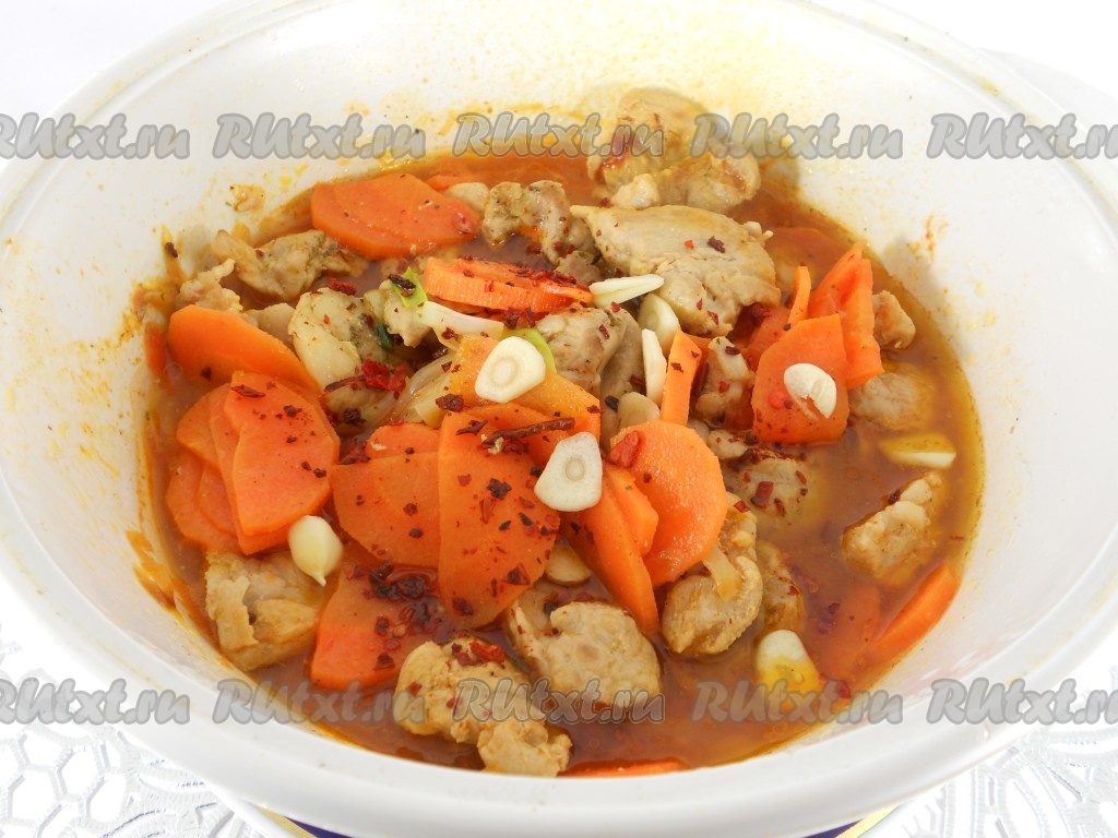 Тушить свинину с морковью и луком на небольшом огне в течение 1 часа. За 15 минут до готовности добавить паприку и порезанный кусочками чеснок.