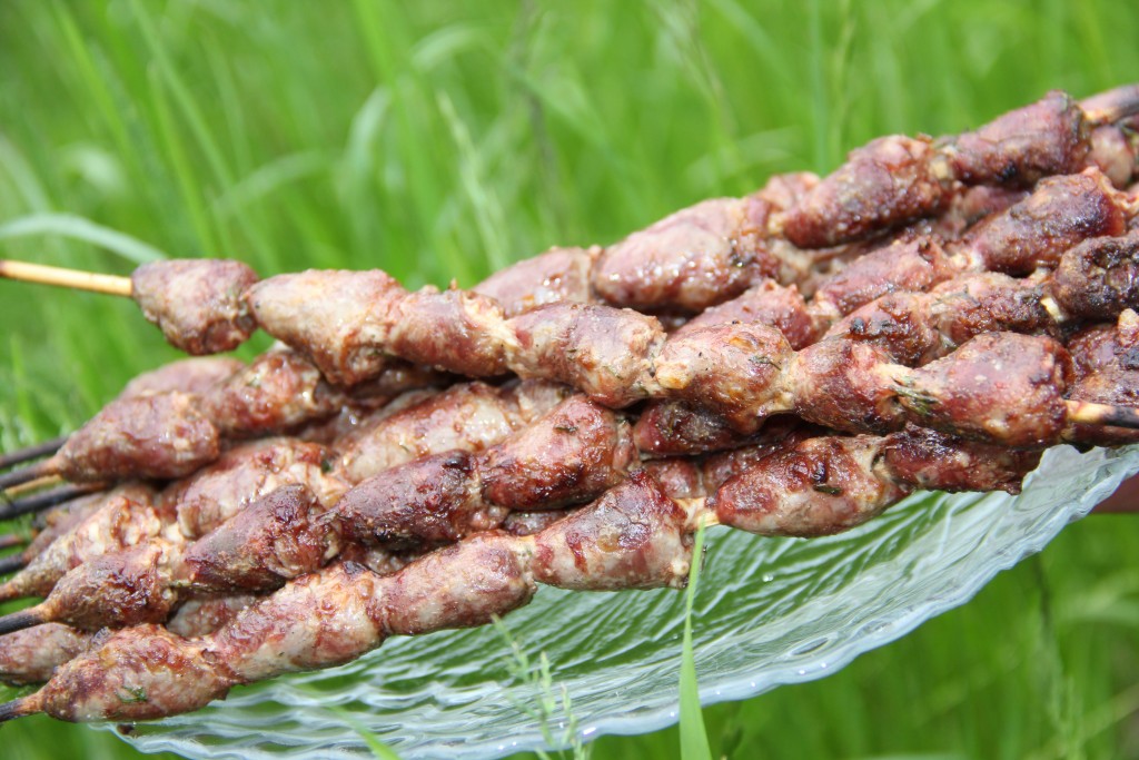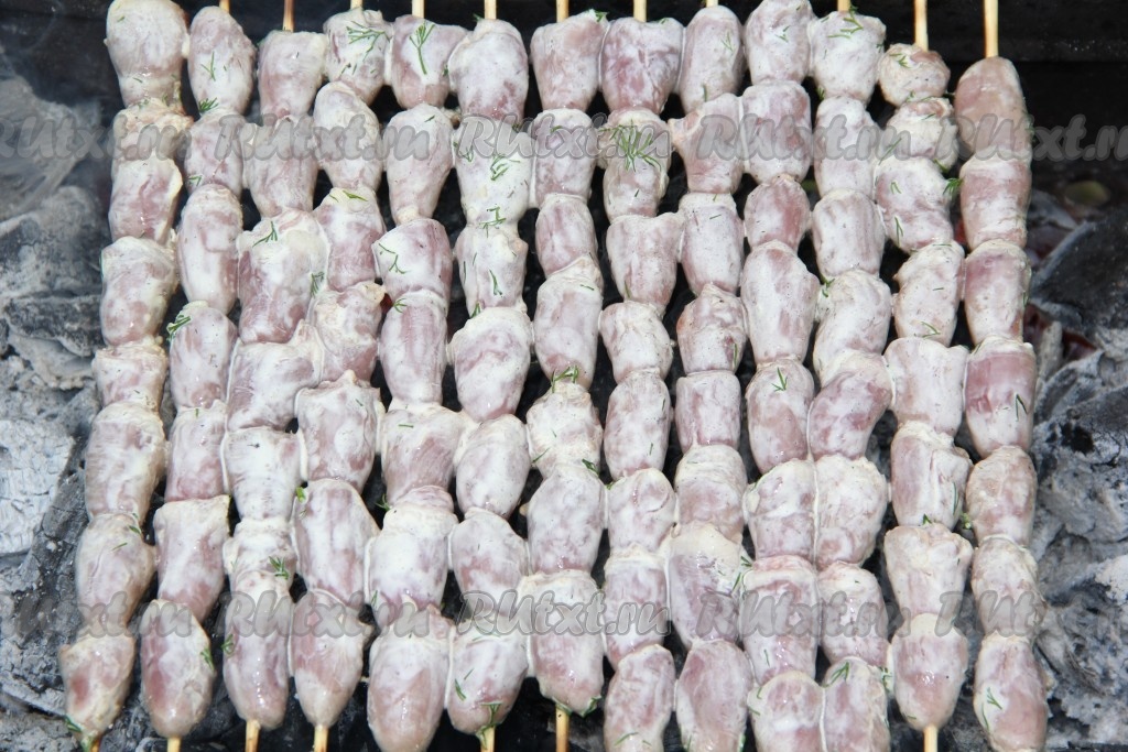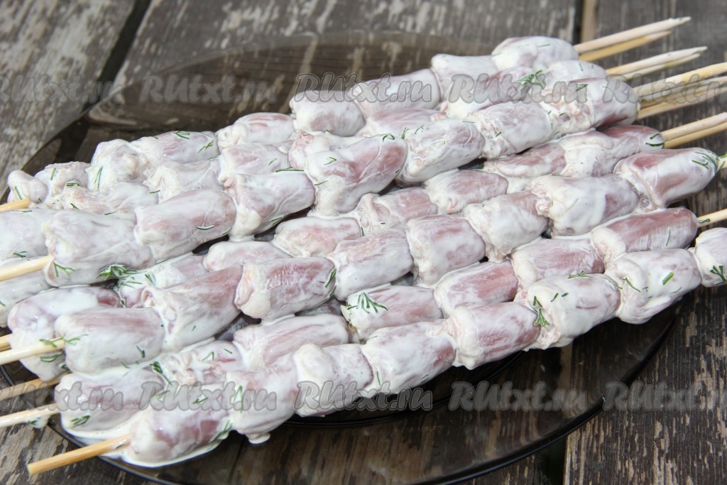 Деревянные шпажки заранее замочить в холодной воде. Замаринованные куриные сердечки нанизать на шпажки.