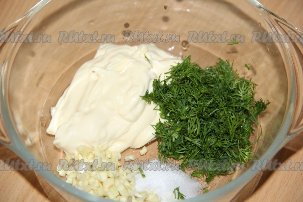 Для начала приготовим маринад: зелень вымыть, обсушить и мелко нарезать. Чеснок почистить и мелко нарезать. В миске соединить майонез, порезанную зелень, чеснок и соль. Всё тщательно перемешать.