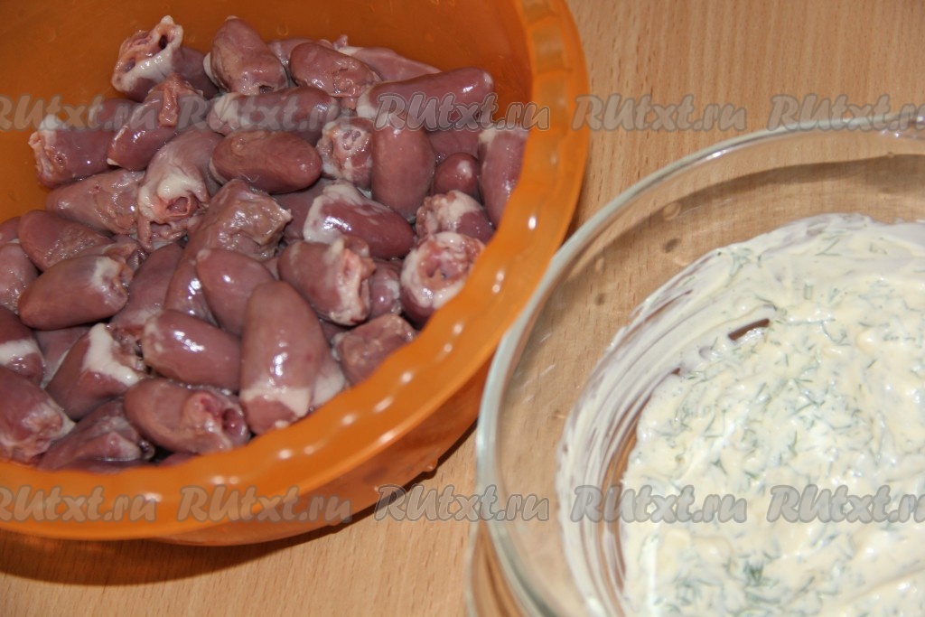 С вымытых куриных сердечек срезать лишний жир и сосуды, откинуть на дуршлаг, чтобы стекла лишняя жидкость.