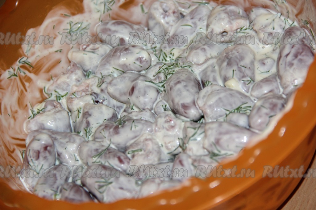 Переложить куриные сердечки в глубокую миску, добавить маринад из майонеза. Всё тщательно перемешать, чтобы сердечки полностью погрузились в маринад и поставить на 2-3 часа (можно и на ночь) в холодильник.