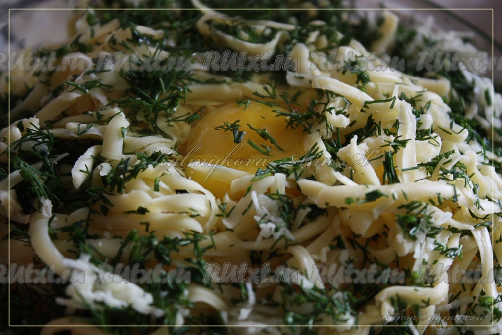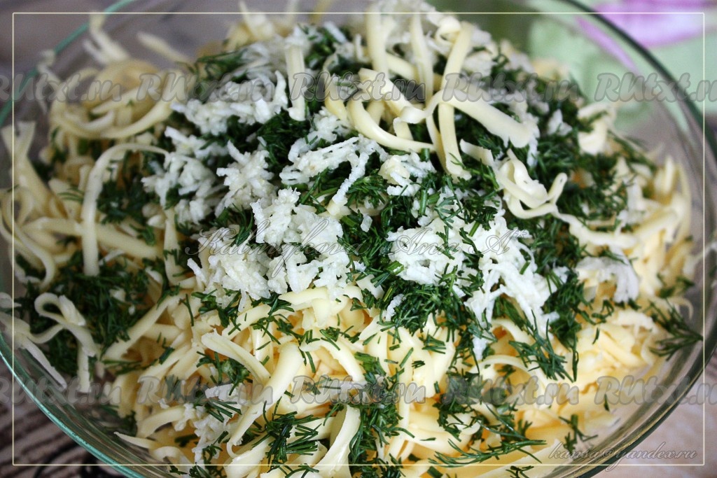Зелень и чеснок измельчить, сыр натереть на крупной терке, всё перемешать.