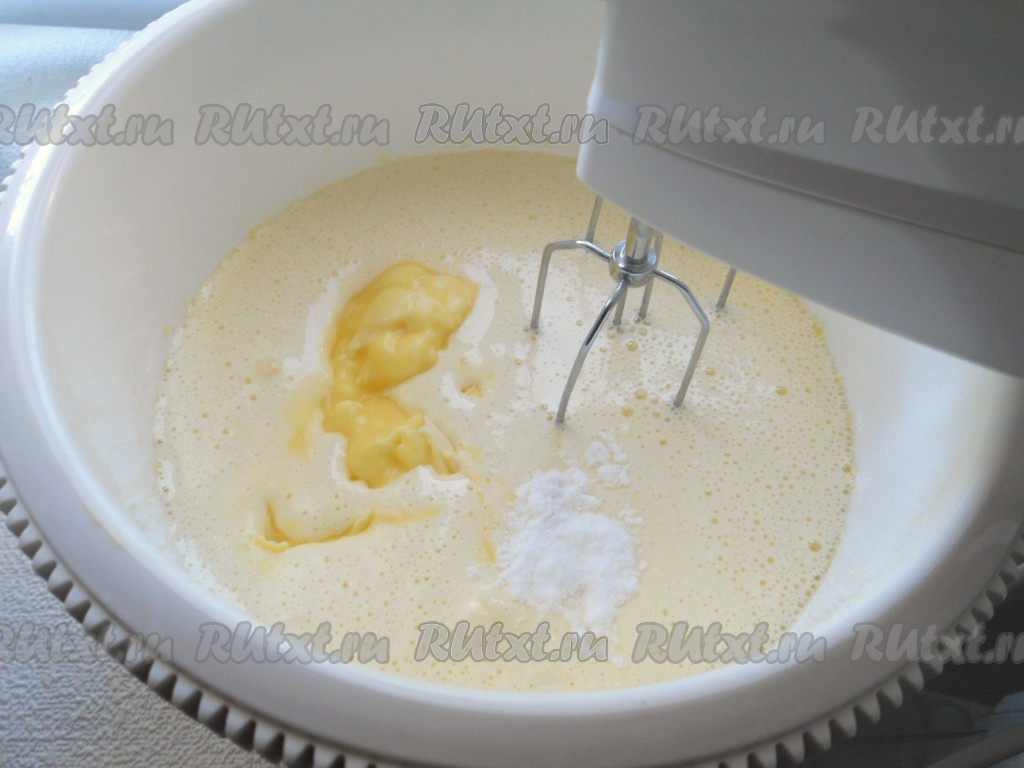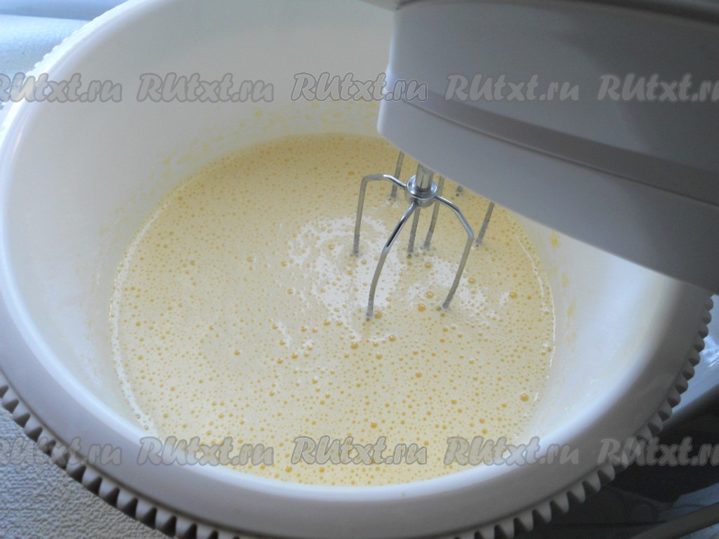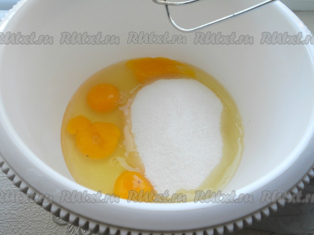 Взбить миксером на высокой скорости яйца с сахаром до светлой, пышной массы (взбивать в течение 5 минут).