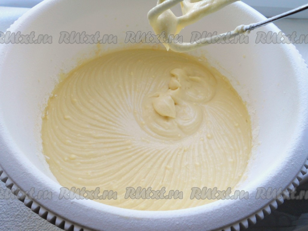 Всыпать разрыхлитель, начать частями добавлять просеянную муку, перемешивая тесто на низкой скорости миксера. Добавляя муку, учитывайте, что тесто должно получиться, напоминающим густой крем, как на фото, оно не должно стекать.
