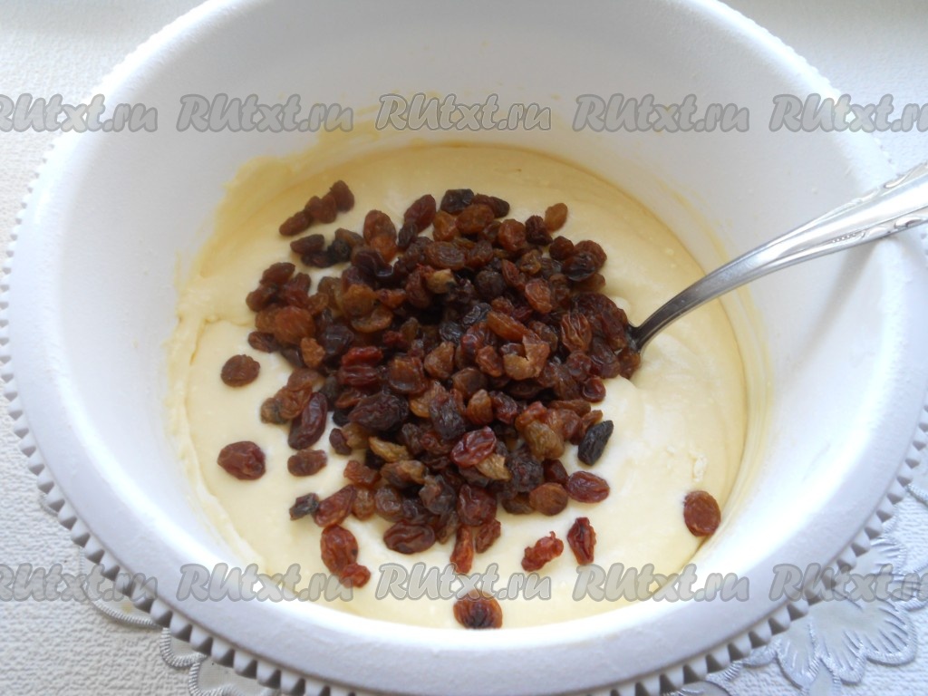 Далее добавить в тесто подготовленный изюм, перемешать столовой ложкой.