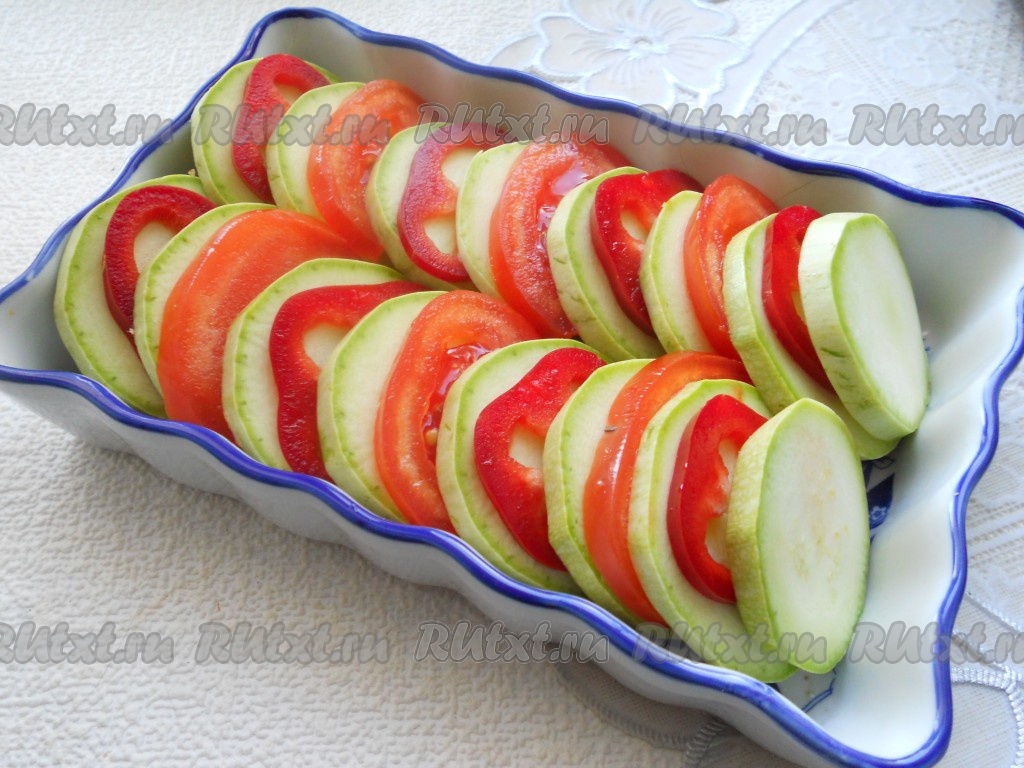 Болгарский перец очистить от семян и плодоножки. Промыть водой помидоры и перец. Помидоры и перец нарезать, как и кабачок, на кружочки толщиной примерно 0,5 сантиметра. Форму для запекания, по желанию, смазать растительным маслом (я не смазывала). В форму для запекания выложить нарезанные овощи вертикально, чередуя их друг с другом.