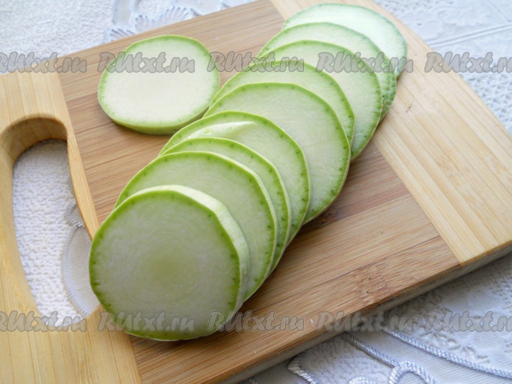 Для этого блюда нужно брать молодой кабачок с мелкими семечками. Кабачок вымыть. При желании кожуру с кабачка можно снять, я не снимала, так как кожица была тонкой. Нарезать кабачок на кружочки толщиной примерно 0,5 сантиметра.