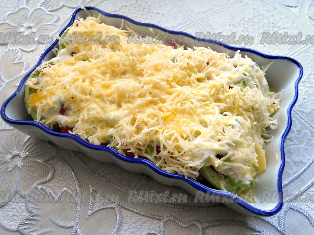 Сверху посыпать овощи сыром, натёртым на мелкой тёрке, и залить яичной массой.