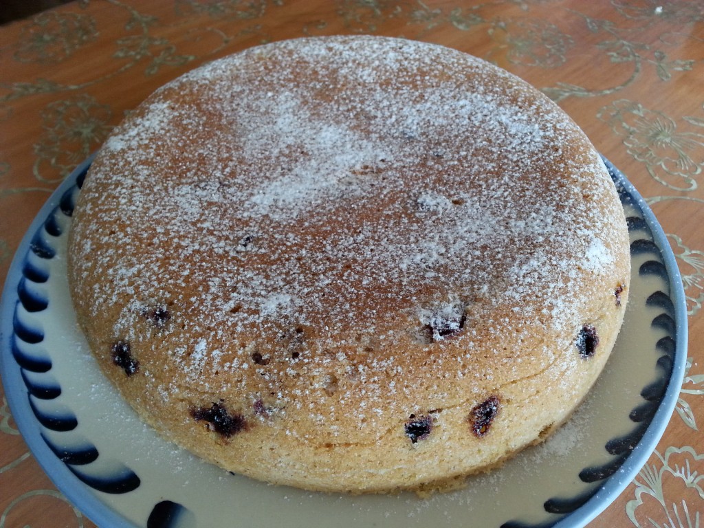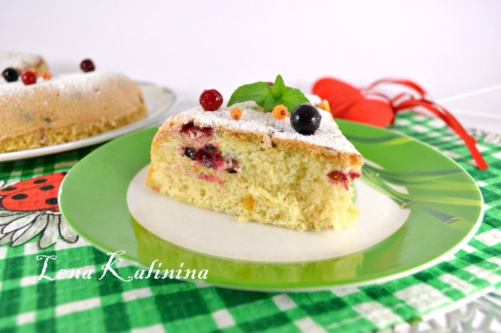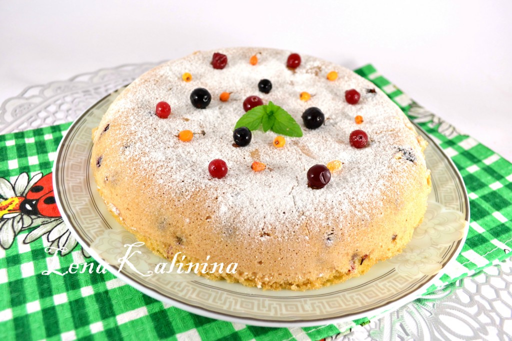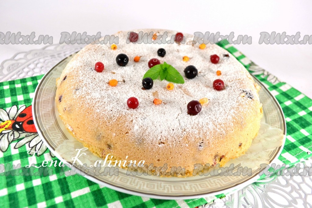 Выставить режим мультиварки "Выпечка" на 90 минут (возможно времени для выпечки понадобится и меньше, смотрите по своей мультиварке). Верх готового пирога должен быть плотным и не липким. После выпечки оставить пирог в мультиварке еще на 15 минут, после чего вынуть с помощью чаши для готовки на пару. Дать пирогу полностью остыть и посыпать сахарной пудрой. Украсить ягодами и листиком мяты.
