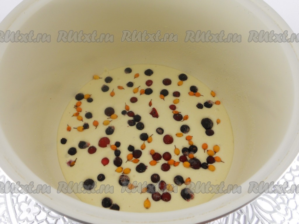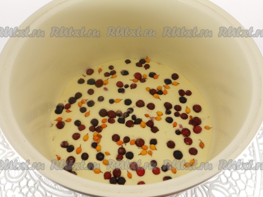 Чашу мультиварки хорошо смазать маслом, можно еще посыпать манкой или сухарями. Вылить половину теста, на тесто выложить половину замороженных ягод.