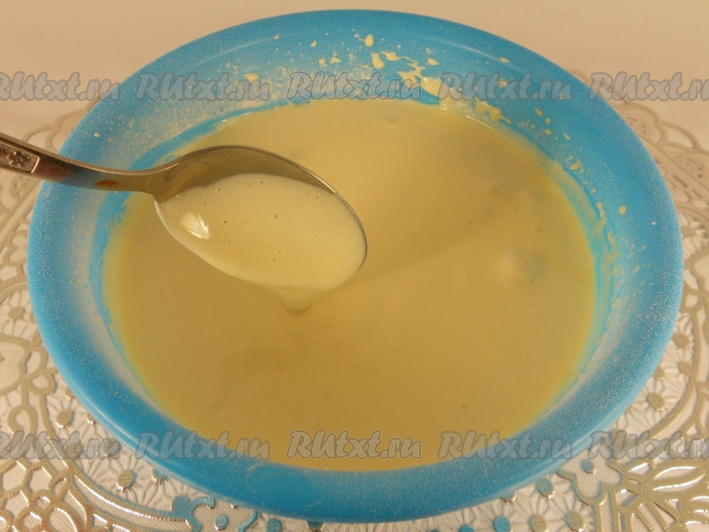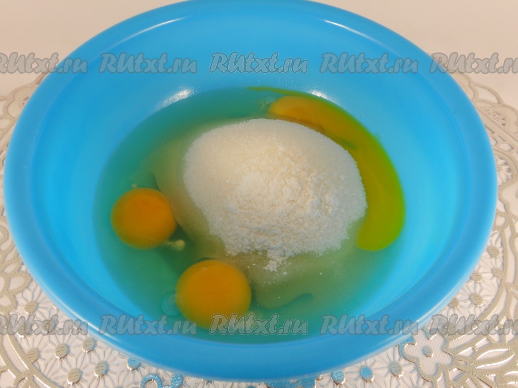 Постепенно, частями, добавлять просеянную муку и разрыхлитель, продолжая взбивать массу. Замесить тесто, по консистенции, как густая сметана.