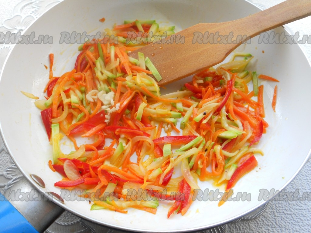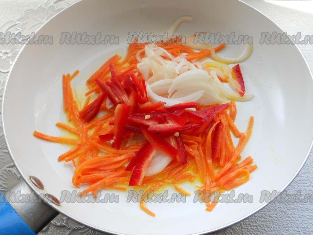 Способ обжаривания овощей следующий: растительное масло разогреть в сковороде. Выложить в сковороду морковь. Жарить на среднем или сильном огне, постоянно помешивая, 3 минуты. Далее добавить в сковороду лук и сладкий болгарский перец. Также, постоянно перемешивая, жарить овощи еще 3 минуты.