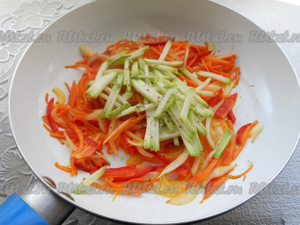 Последними добавить в сковороду кабачки. Точно также жарить все вместе 3 минуты. Посолить и поперчить.