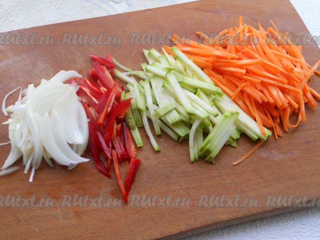 Кабачок, морковь, сладкий болгарский перец нарезать одинаково - тонкой, длинной соломкой. Лук репчатый - тонкими полукольцами.