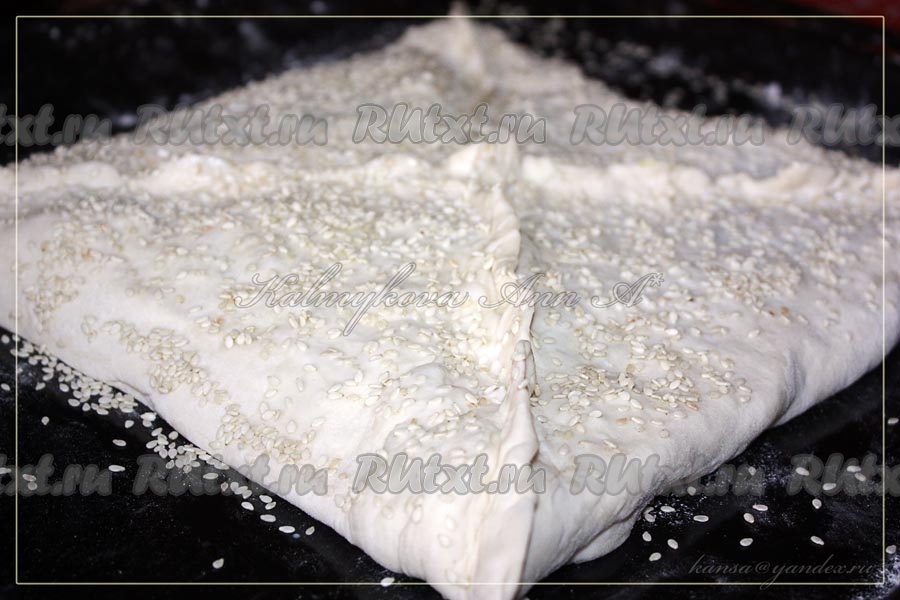 Собрать пирог конвертом и защипнуть края (как на фото). Сверху промазать пирог молоком и присыпать семенами кунжута.