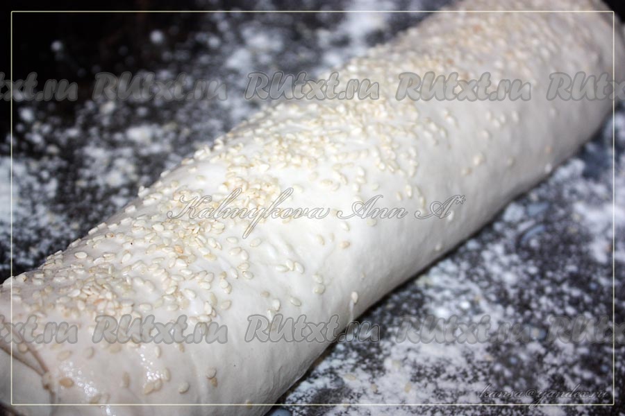 Также верх пирога смазать молоком и присыпать кунжутом. Выпекать 30-45 минут при температуре 180 градусов.