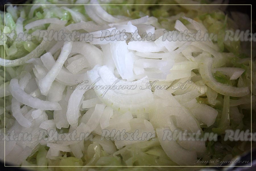 Нарезать репчатый лук, добавить к капусте и тушить до готовности овощей.