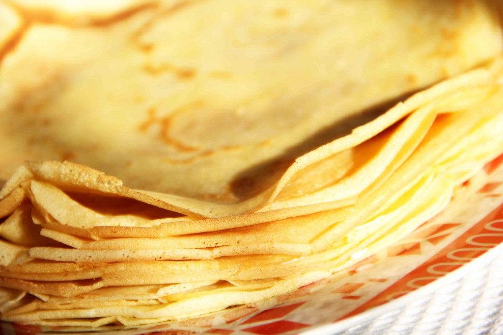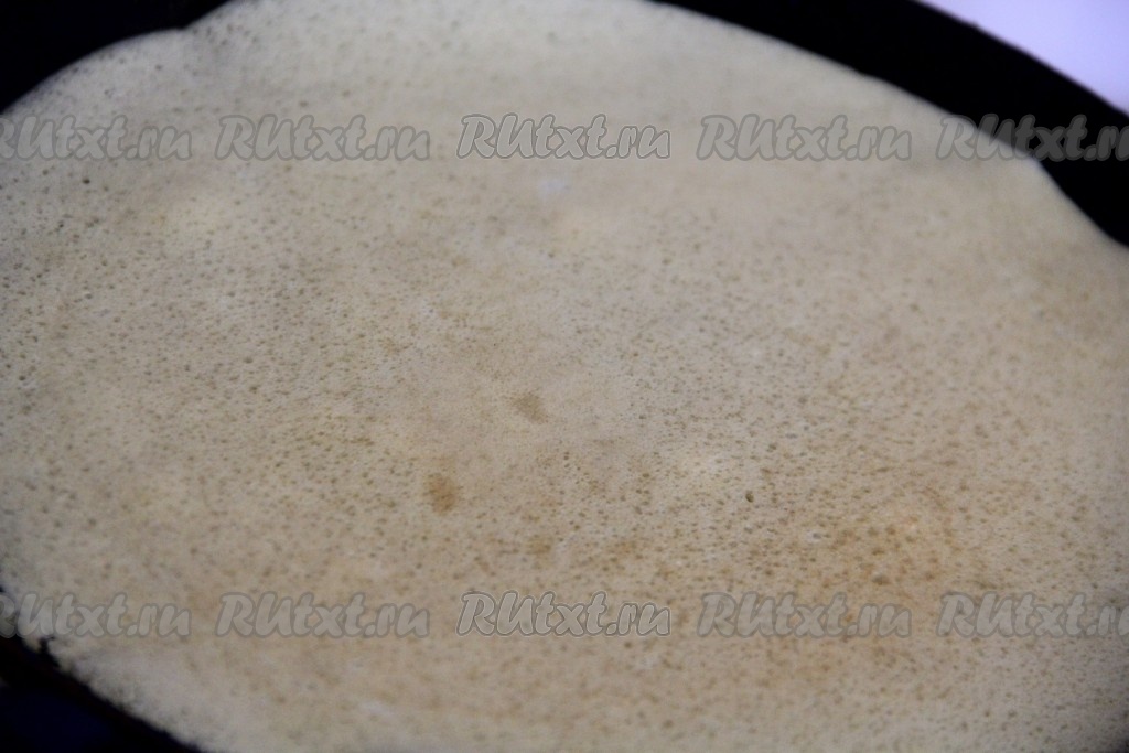 Выпекать блинчик с двух сторон до золотистого цвета, затем переложить его на тарелочку. Постепенно испечь все бархатистые блинчики с тонкими, приятно похрустывающими краешками.