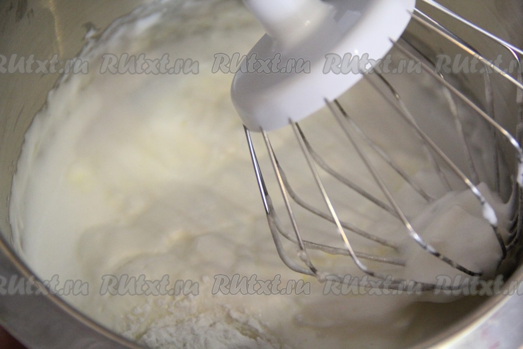 Затем к белково-масляной смеси добавить молоко и крахмал, перемешать на низкой скорости миксера.