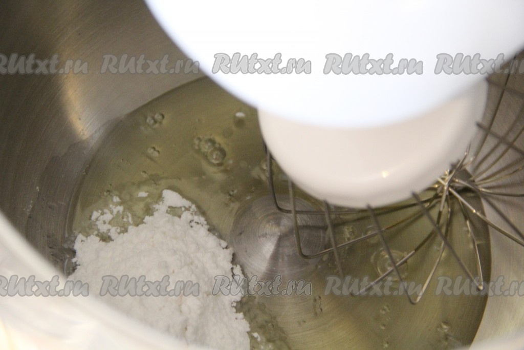 Белки аккуратно отделить от желтков. В чашу миксера влить яичные белки, добавить лимонный сок и сахарную пудру (или сахар). Взбить белки миксером до стойких пиков.