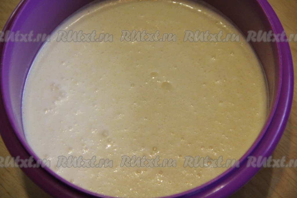 Далее всыпать муку, разрыхлитель и соль. Перемешать на низкой скорости до однородного состояния. Блинное тесто получится не густым, но и не жидким, перелить его в глубокую миску.