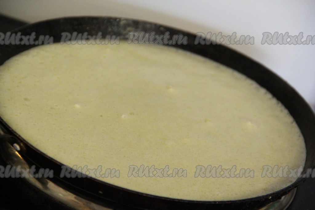 Сковороду хорошо накалить на сильном огне. Смазать сковороду растительным маслом, только перед первым блином, далее смазывать необязательно, так как эти блины хорошо переворачиваются. Сделать нагрев средним. Вылить небольшое количество теста на сковороду и хорошо его распределить по всей сковороде.