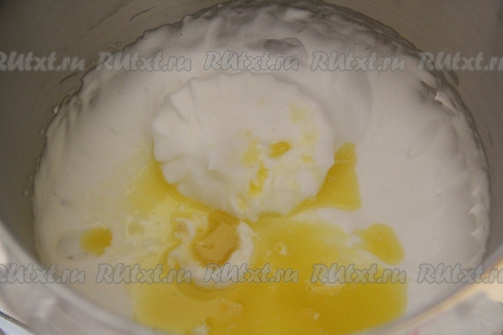 Сливочное масло растопить и слегка остудить. Добавить растопленное масло к взбитым белкам и перемешать на низкой скорости миксера, вмешивая масло.