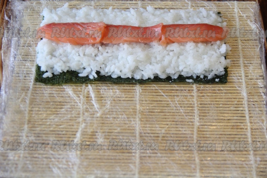 Выложить рис на лист нори и аккуратно его распределить по всей поверхности. Оставить пустым дальний от вас край шириной 1 см. Чтобы рис не лип к рукам, смочите руки в подкисленной воде. Я в мисочку наливаю воду и добавляю немного лимонного сока.