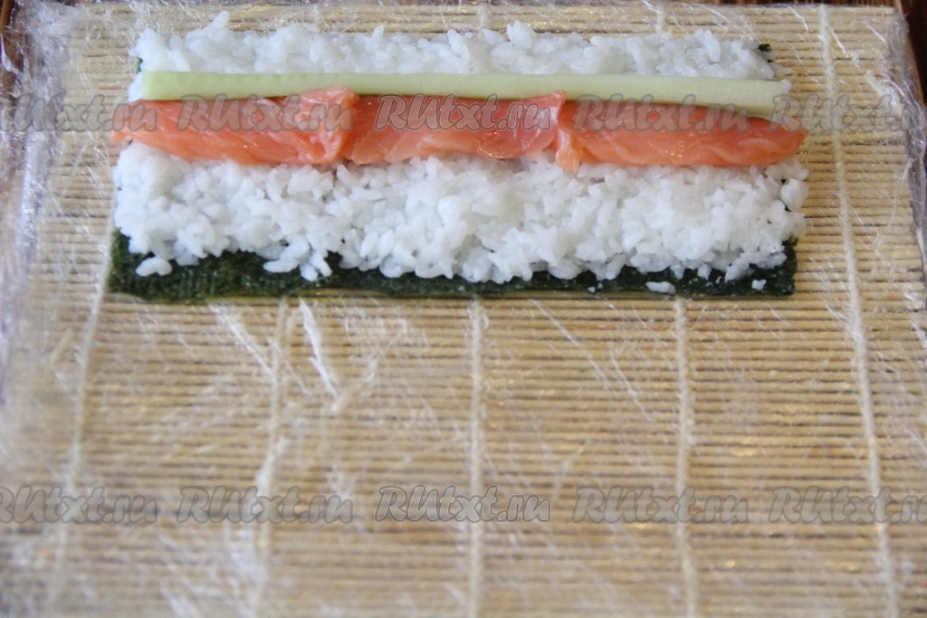 Количество продуктов берите по своей потребности, я всегда делаю большое количество роллов. Рис для приготовления суши тщательно промыть. Я высыпаю рис в сито и промываю под проточной водой. Выложить рис в кастрюлю и залить водой. Поставить кастрюлю с рисом на средний огонь. Довести рис до кипения, затем убавить огонь и варить рис под крышкой 15 минут. Готовый рис снять с огня, лишнюю воду слить, добавить рисовый уксус, хорошо перемешать. Накрыть кастрюлю с рисом полотенцем и остудить. Листы нори разрезать пополам. Рыбу нарезать на длинные кусочки. Огурец очистить от кожуры, нарезать длинными брусочками.
