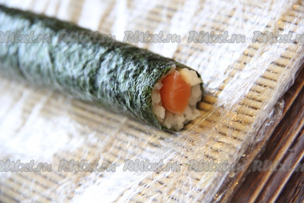 Завернуть ролл в плотный рулет, слегка прижимая его циновкой по всей поверхности.