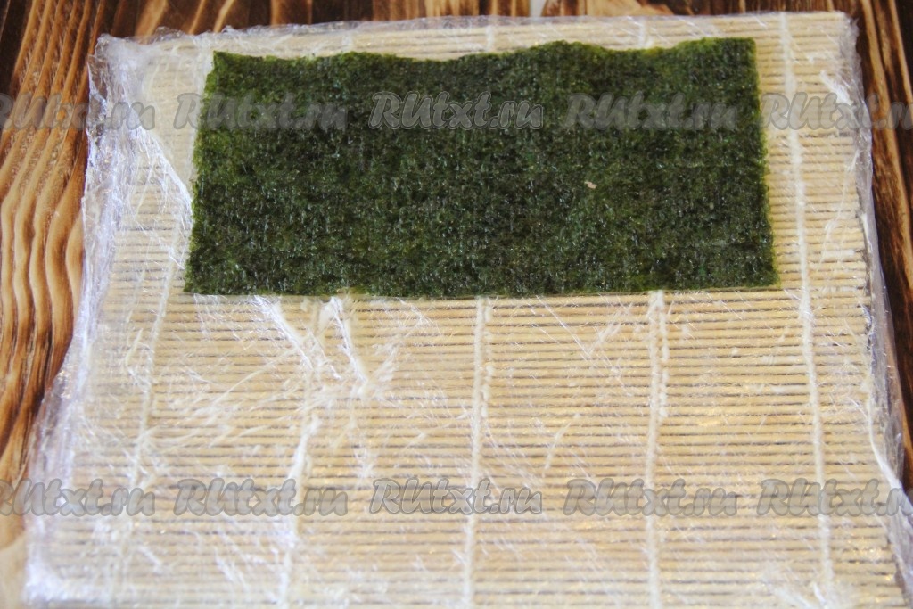 Подготовить циновку, я предварительно оборачиваю циновку пищевой плёнкой и смазываю её тонким слоем майонеза. Выложить лист нори блестящей стороной вниз.
