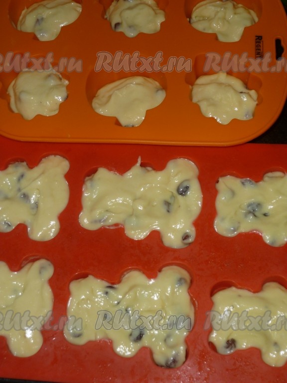 Тесто выложить столовой ложкой в формочки для маффинов (у меня силиконовые), заполняя их на 3/4 объема.