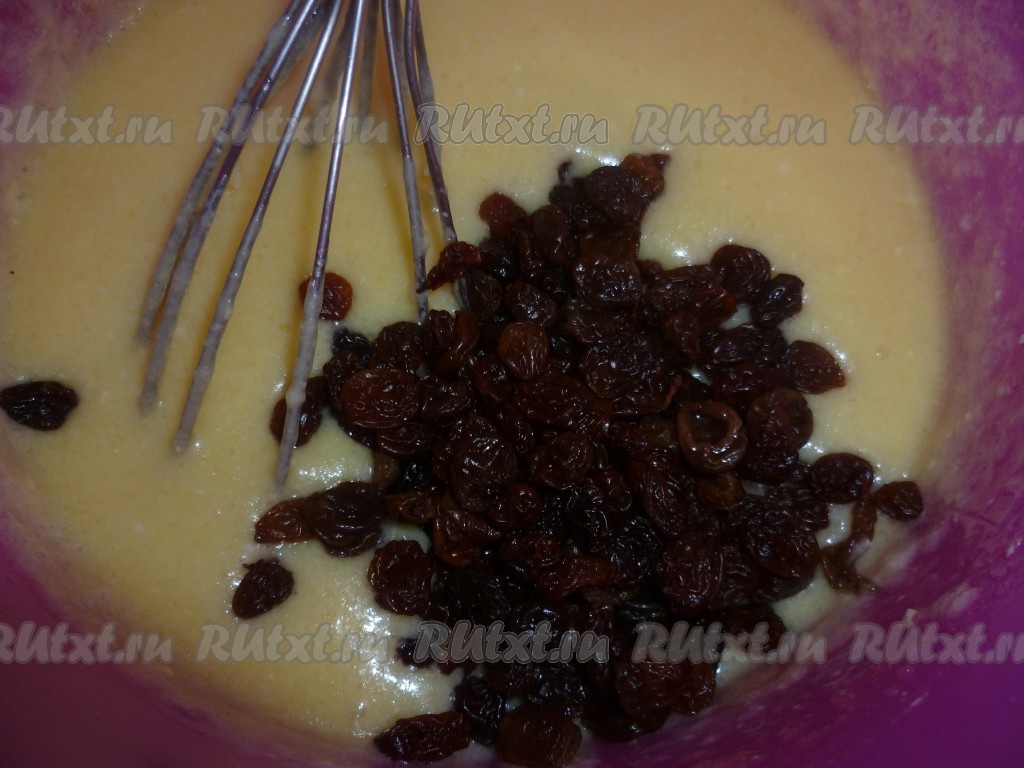 Добавить изюм, заранее запаренный в кипятке и просушенный. Перемешать.