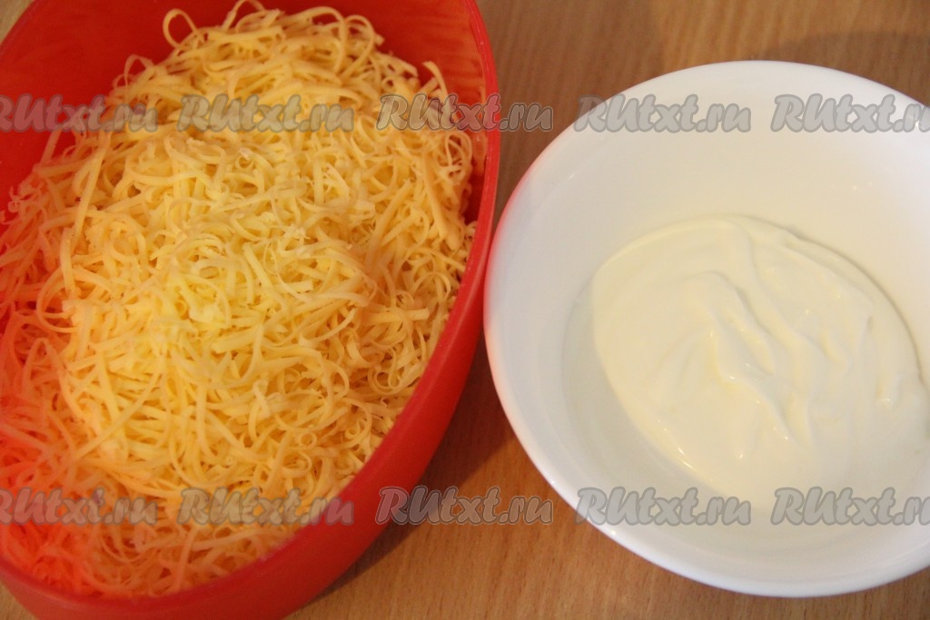 Сыр натереть на мелкой тёрке. Сметану можно использовать 15% или 20% жирности.