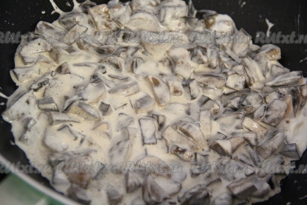 Добавить сметану к грибам. Посолить и поперчить по вкусу. Всё хорошо перемешать и довести до кипения на медленном огне.
